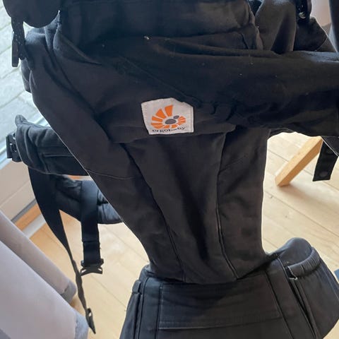 Ergobaby bæresele i sort og beige farve. Designet til at give støtte og komfort ved bæring af baby. Justerbare stropper og polstrede dele for bedre pasform og brugervenlighed.