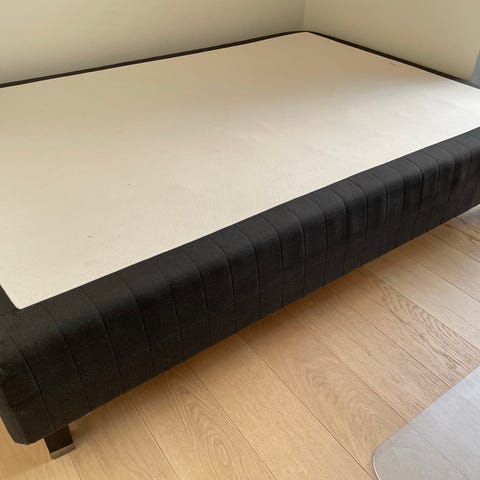 IKEA Skäfer madras med betræk i lysegrå og hvid. Madras med synligt brugsmærke på overfladen. Kan nok fjernes med pletfjerner.