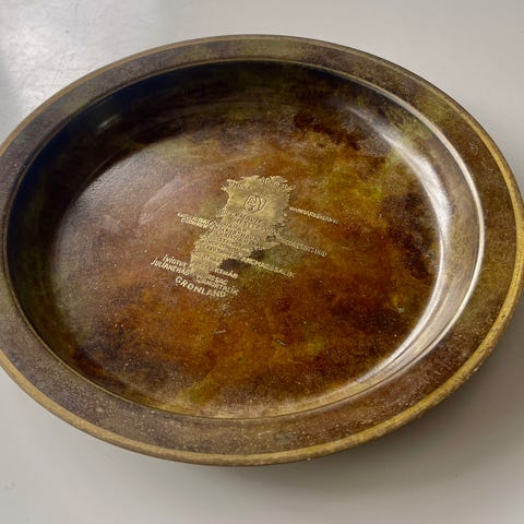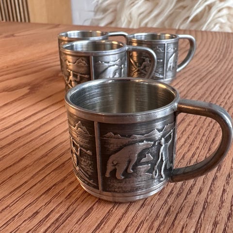 Købt i 50’erne, da familien boede på Disko-øen i Godhavn. Helt nye og ubrugte, da de bare har ligget i en skuffe. Udskåret med fiskemønster. Der er 2 stk som er 14,5 cm og 4 stk som er 13,5 cm. Kom med et bud - sælges bedst muligt.