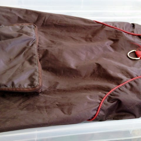 jakken er god dækkende med hætte og stof også under hunden også. Smart lomme til poser eller andet. Nem velcro lukning. Sælges da vi har fået ny hund der er for stor til dragten.