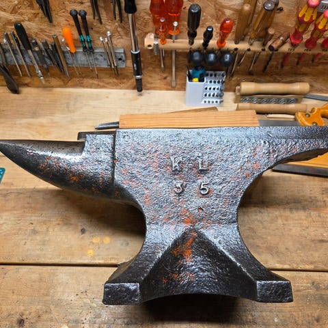 Den har fået en let klargøring, støbesamlinger slebet af, horn afrundet og slagfladen udjævnet. Til sidst beskyttet med olie.