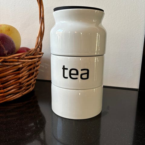 Højden er 22 cm. Diameteren er 11 cm. Hvert rum kan indeholde 100 g løs te.
