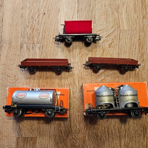 Div. Märklin godsvogne fra nedlagt modelbane sælges samlet. Det er lidt brugsspor men alle virker intakte og køreklare. Kassen til den lange transportvogn er skæve I plasten og sidder ikke fast. Tuborgvogn har flere brugsspor - se billeder.