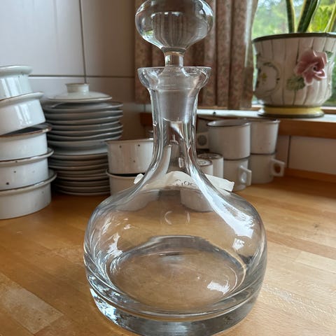 Rund glaskaraffel med en glat, gennemsigtig overflade, der måler 20x17 cm. Den har en bred bund og en smal hals, hvilket gør den perfekt til servering af vin eller vand. Karafen har en metalprop, der sikrer en tæt lukning. fra Holmegaard