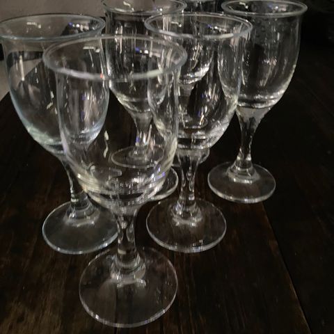 Sæt af fem klare vinglas med en stilk og bred base. Designet har blomsterlignende struktur på bunden af glasset, hvilket giver det et unikt udseende. Glassene har en størrelse på cirka 4 cm i diameter og 7,5 cm i højde, hvilket gør dem perfekte til servering af mindre mængder vin eller andre drikke. Glasmaterialet virker robust og egner sig til både formelle og uformelle arrangementer.