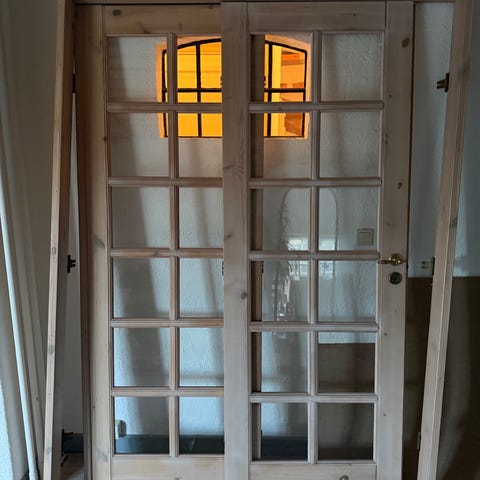 Flotte Svedoor-Kilsgaard dobbeltdøre i glas i massivt træ. De er virkelig tunge. Dørene er specialbyggede med en højde på 194 cm. Der er to sæt