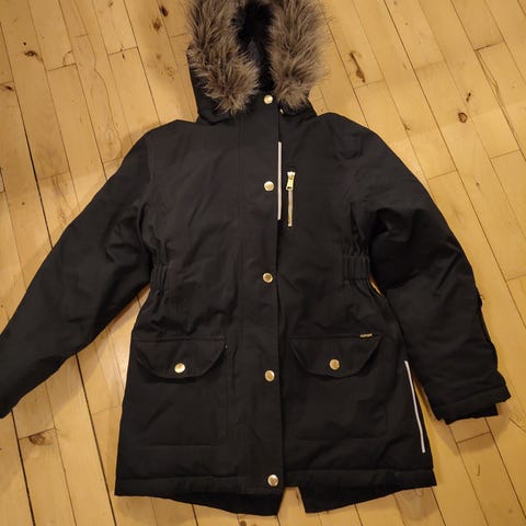 En lilla vinterjakke med hætte og knapper foran. Ærmerne har elastiske manchetter for bedre pasform. Der er en lille badge med brandnavn foran og en refleksdetalje bagpå for øget synlighed.