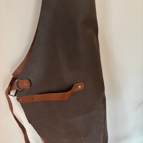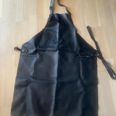 Helt nyt forklæde i læder med justerbare stropper og lommer. Velegnet til brug i køkkenet, ved grill eller til hobbyarbejde. Forklædet er mørkebrunt og har et robust udseende, med en størrelse på 90x66 cm.