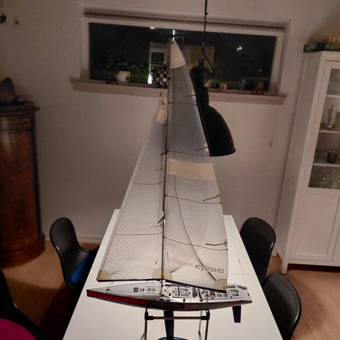 Denne modelbåd er fastgjort i en ramme og har et design, der efterligner en traditionel sejladsbåd. Farverne er primært blå og hvid med et lille flag monteret på båden. Båden har en mast med sejl og en lille kaptajnshytte. Størrelsen af objektet i rammen er 16x11 cm.