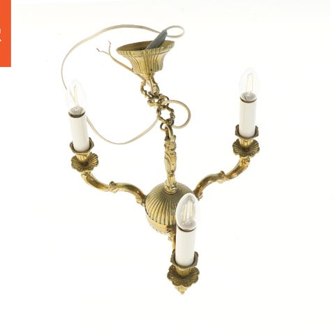 Vintage lysekrone med metalramme og geometriske glasdetaljer, skaber en unik og elegant belysningsløsning. Lysekronen har en dimension på 17x23x12 cm, ideel til pynt eller som en effektiv lyskilde. Den har synlige aldringstegn med patina på nogle dele af metallet. Glasdetaljerne har indridsede mønstre, der tilføjer en art deco følelse til designet.
