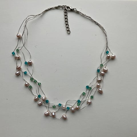 Halskæde, halvædelsten, sølg og div. perler., Unika