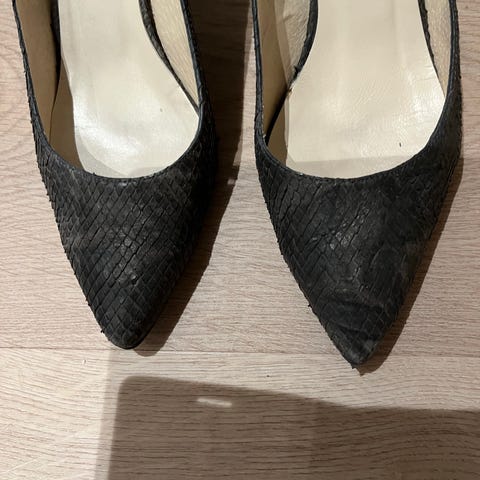 Et par hvid slangeskinds sko med hæl. Skoene har en unik bølgeformet kant langs åbningen og en metalisk detalje på tåen. Størrelsen af skoene er 36. Undersiden viser tegn på slid.