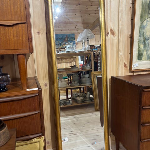 Et par dekorative spejlrammer med en elegant, detaljeret guld-look design. Rammen har et integreret krog i bunden, hvilket gør den ideel til ophængning af lette genstande. Begge spejle har en rektangulær form med prydende kantdetaljer, der giver dem en antik stil. Bagsiden er dækket med en kartonplade, der holder spejlet på plads. Størrelsen på hvert spejl er 28,5x16,5 cm.