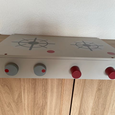 Dette er et vintage miniature legetøjskomfur lavet af metal, med en ovnlignende struktur og røde knapper til kontrol. Den primære farve er hvid, og komfuret har en rustik patina fra brug. Bagsiden af objekten er perforeret med små huller, hvilket måske indikerer elektriske komponenter eller ventilation. Målene er 16,5 cm i bredde.
