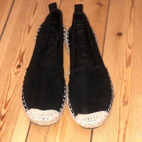 Denne vare er et par komfortable sorte espadriller. De har en flad stofoverdel med jutesål og skumgummi ydersål. Strukturen er enkel med en slidstærk bund og god pasform, hvilket gør dem ideelle til afslappet sommerbrug. Størrelsen er 38.