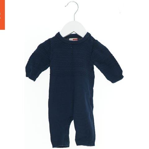 En grå babydragt strikket i et varmeisolerende stof. Dragten har lange ærmer og ben samt en hætte til ekstra varme. Den lukkes med knapper foran, hvilket gør den let at tage af og på. Dragten har en kabelstrikdetalje langs knaplukningen.