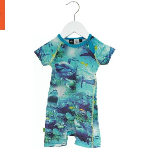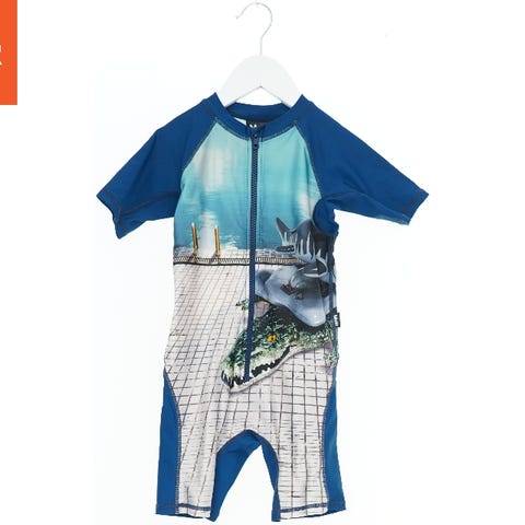 En langærmet UV-dragt med haj-motiv i blå nuancer. Dragten har en praktisk lynlås på siden samt trykknapper ved benene. Designet beskytter mod solens stråler og er ideel til strand- eller poolaktiviteter.