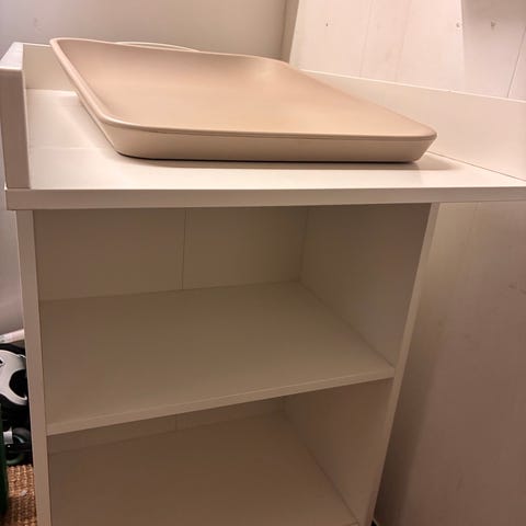 IKEA puslebord i hvid med to skuffer og udtrækshylde. Puslebordet har mindre brugsspor og ridser, som vist på billederne. Egnet til opbevaring og pusleplads til børn.