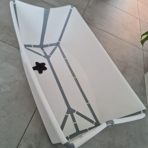 Stokke Flexi Bath børnebadekar med sammenklappelig funktion og grå støttepude. Badekarret er designet til børn og kan foldes sammen for nem opbevaring og transport.