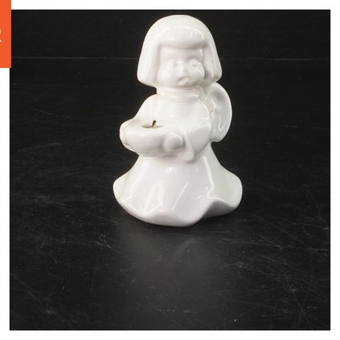 Denne lysestage er formet som tre engle, der holder en skål til et lys. Den er lavet af et tungt materiale, muligvis keramik eller sten. Giver et dekorativt indslag til hjemmet med en antik stil. Under bunden er der rødt felt. De er detaljeret udskåret med vinge og draperinger. Tags: engel, lys, dekoration, antik.