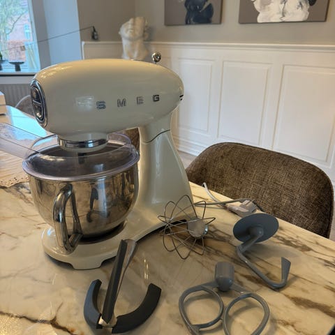 SMEG stavblender med tilbehør i hvid farve. Indeholder stavblender og alt det tilhørende tilbehør. Kassen har nogle skader men produktet er ikke brugt overhovedet.