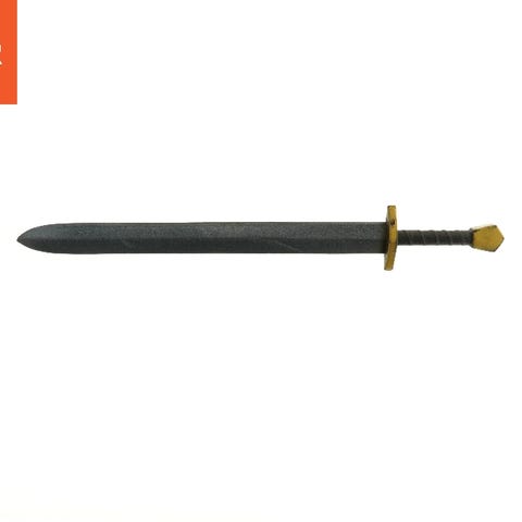 Objektet er et skumsværd designet til rollespil eller leg. Sværdet, som måler 76 cm i længden, har en grå bladfarve og et sort håndtag med gylden hilt. Det er let og sikkert for brug i ikke-seriøse kampe eller som tilbehør til kostumer.