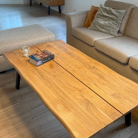 Sofabordet er i birketræs finer med sort linolium og benene er i jern