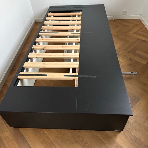 Nordli IKEA seng med i alt seks skuffer, så god plads til opbevaring. Dertil spring- og topmadrasser ovenpå fra JYSK. Få tegn på brug, da der altid har været skånelagen øverst.