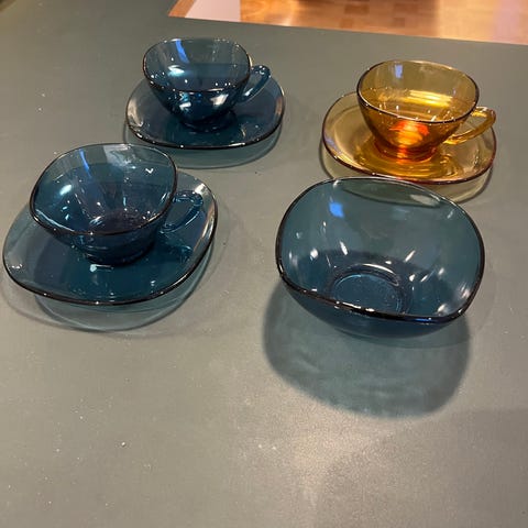 Duralex glas service i blå farve bestående af 6 kopper med underkop, 4 små og 4 store tallerkener og 2 skåle. Fremstillet i glas med et karakteristisk mønster. Prisen er samlet for det hele.