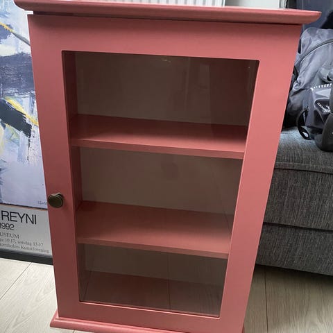 Sælger et lille vitrineskab til at hænge på væggen. Det fejler intet, men trænger til en gang maling.