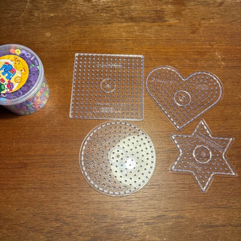 Hama perler til børn i assorterede farver med forskellige former på plader, herunder hjerte, stjerne og alfabet. Materialet er plast, og sættet indeholder flere poser med perler samt 20 stk. firekantet storeplader til brug ved perleprojekter.
