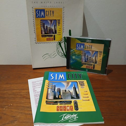 Sim City 2000, Maxis. IBM 386 PC-spil fra 1993. Spillet inkluderer originale disketter (2. stk - ikke testet for nyligt), manualer, papirværk og stor æske.