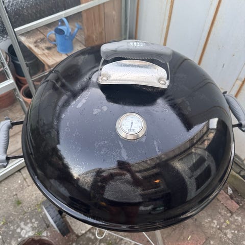 Stor Weber kuglegrill i sort med låg, udstyret med hjul for nem transport. Der medfølger 2 Kulbakker til fordeling af kul.