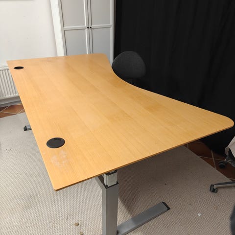 Brugt hævesænkebord gives væk. Det kører fint op og ned. Kan komme op til cirka 130 cm i højden og ned til 65 cm