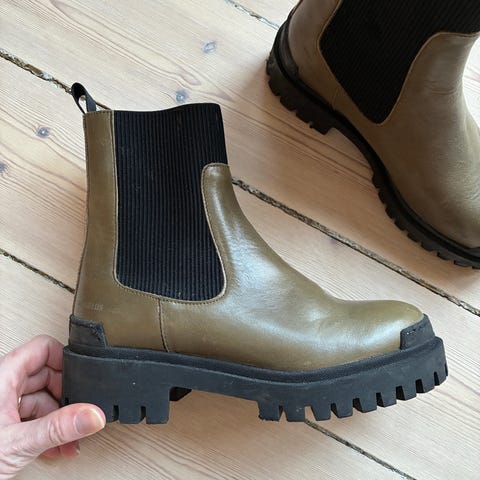 Angulus børnestøvler til unisex i størrelse 36. Støvlerne har en beige læderoverdel med sort elastisk skaft og sort gummisål med mønster for bedre greb.