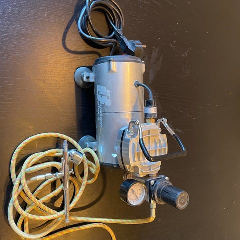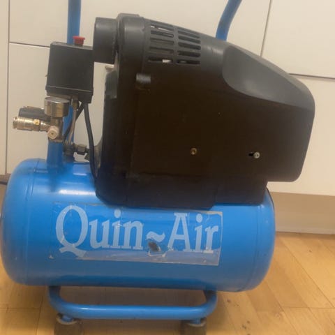 Quin-Air kompressor med en motor på 2,5 HK, oliefri drift, driftsspænding på 230 V / 50 Hz, og en tankkapacitet på 24 liter. Maksimalt tryk er 8 bar. Kompressoren vejer 32 kg og har dimensionerne 57,5 x 44,5 x 74 cm.
