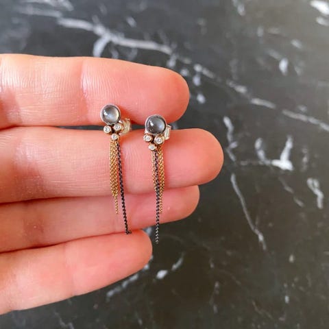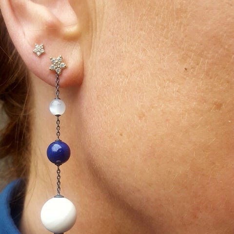 Dråbevedhæng på billedet haves ikke, men øreringene har en lille skjult bøjle til at hægte ekstra vedhæng på som vist på billedet.
