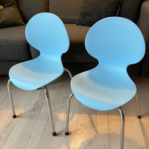 To fine og sjældne Arne Jacobsen t-stole til børn. Siddehøjden er 33cm. Har lidt patina, men fremstår rigtig flotte og med fast ryg.