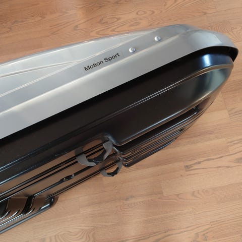 Brugt til én skiferie. Næsten ny. Stilfuld og rummelig tagboks, der er optimeret, så den er nem at bruge.