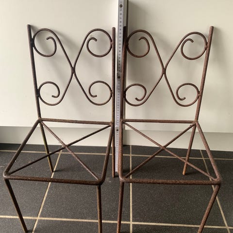Sæt bestående af to børnestole med rødt stel og polstrede sæder med mariehøne motiv. Stole har armlæn og foldbar funktion, velegnet til børn.