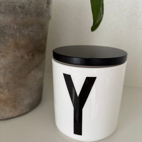 Design Letters opbevaringskrukke med låg, fremstillet i hvidt porcelæn med sort trælåg.