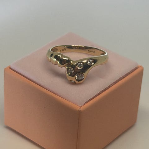 Smuk guldring i høj karat (ikke angivet), rød krystalsten, diameter 1,8 cm. Vejer 2 gram. Købt på Teneriffa i 1961.