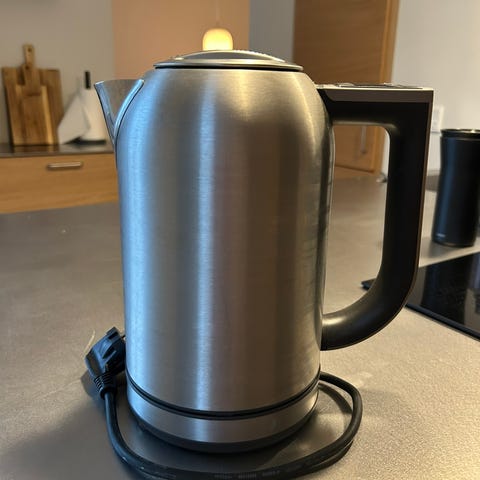 KitchenAid kedel i cremefarvet rustfrit stål med sort håndtag. Kedlen har en rund form og en indvendig belægning i rustfrit stål. Den egner sig til opvarmning af vand på komfur.
