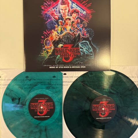 Stranger Things Soundtrack vinylplader i rød og hvid marmoreret farve. Indeholder to plader med musik fra serien Stranger Things. Velegnet til samlere og fans af serien. Soundtrack