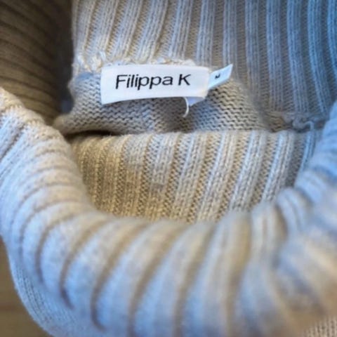 Filippa K Rullekrave sweater i beige farve. Sweateren er i størrelse 38 og lavet af chiffon materiale. Designet til kvinder med ribstrikket struktur og høj hals.