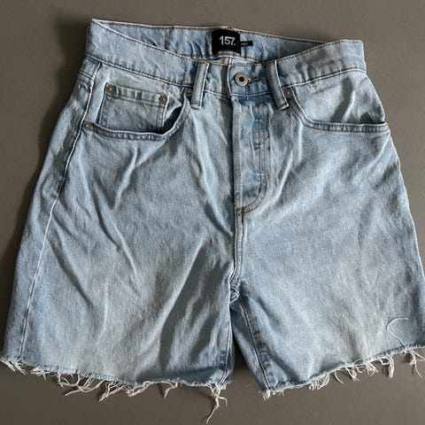 Lager 157 denim shorts i blå farve, størrelse XS til kvinder. Shortsene er fremstillet i denim materiale og har en knaplukning foran. De har lommer foran og bagpå samt rå kanter nederst.