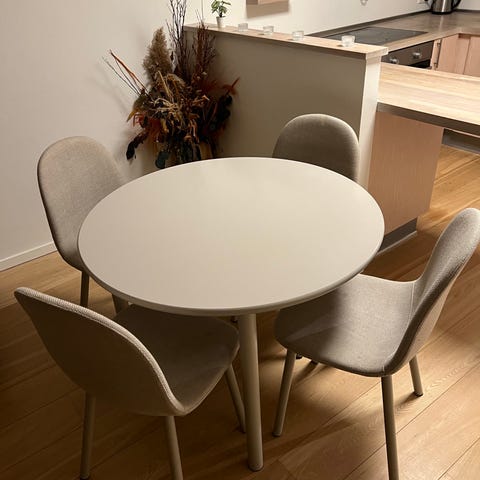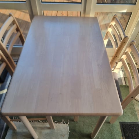 Træbord fra IKEA med 4 spisebordstole inklusiv, samt puder medfølger