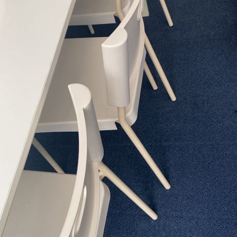 Stolene: 4 hvide stole medfølger. De er i god stand og fejler intet funktionelt, men malingen er en smule slidt på grund af brug (se billeder). En hurtig omgang maling kan gøre dem som nye igen, eller de kan bruges som de er.
