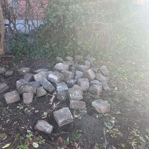 Mørke portugisiske brosten 15 kr pr stk. Der er 300-350 stk nogle af dem med lidt beton rester. Mindst 1 overflade er uden beton rester, så de vil fungere rigtig godt som brostens belægning