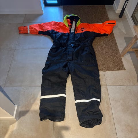 Ubrugt ABU flydedragt i blå og gul farve. Fremstillet af materialer inklusive NBR foam, neopren og polypropylen. Designet til funktionelt brug med flere lommer og lynlåsdetaljer.